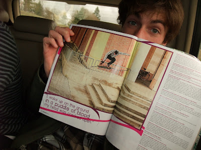 durante il ritorno, ero li a chekkare un paio di riviste sparse dentro la macchina e guarda che mi trovo davanti?! il numero di skateboarder con dentro l'intw di andre' genovesi e una delle foto (precisamente questa qua in basso) e' stata scattata da un mio carissimo amico chiamato davide biondani! appena ho spiegato ai boys il motivo per cui volevo fatta questa foto tutti si sono gasati!