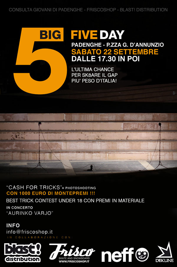 Lo scorso anno in collaborazione con Frisco Shop vi avevamo invitato a Skateare i BIG 5 Di Padenghe sul Garda per l'ultima volta prima che la "sentenza" di morte per il celebre spot venisse eseguita. A distanza di un anno lo spot è ancora al suo posto e la... Perchè dunque non ritornare a fare qualche trick nuovo?Sabato 22 Settembre alle 17:30 prenderà il via l'evento una session riservata agli invitati alla caccia del nuovo BEST TRICK dal drop più peso d'Italia. Grazie all'intervento di nuovi sponsor ed il consueto super-impegno di Frisco Shop l'edizione 2012 dell'evento avrà un montepremi ancora più ricco: 1000 Euro. Potete seguire gli aggiornamenti riguardanti il contest e la rider's list su Facebook. Keep Pushing.