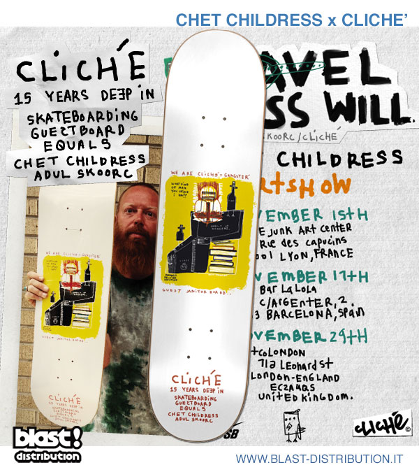 Clichè Skateboards continua nella celebrazione del proprio 15° compleanno e completa la serie delle collabo 2012 con Chet Childress che firma questa tavola con un proprio Artwork.