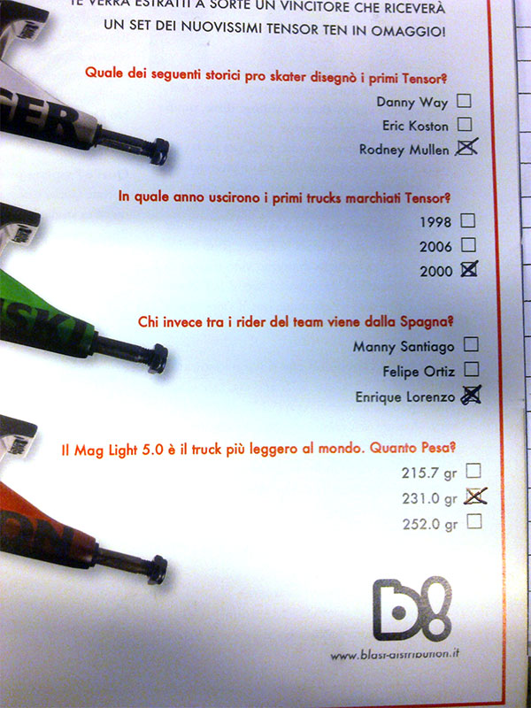 Abbiamo un vincitore per il Concorso TENSOR Trucks riservato ai lettori di 6:00AM. Si tratta di Alexander Pellegrin di Cinisello Balsamo (MI) queste sono le sue risposte: