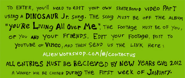 Alien Workshop ha recentemente lanciato un interessante concorso che certamente appassionerà skater e video maker dai gusti musicali ricercati. L'amicizia, l'intesa tra Neil Blender (mente di Alien AWS) e J.Mascic (cantante, chitarrista dei Dinosaur Jr.) non è certo un mistero. Di fatti la collaborazione artistica tra Alien e Dinosaur Jr. vanta ormai una 20ina di anni di storia. Proprio da questa unione nasce il concorso recentemente lanciato dalla company dell'Ohio proprio con collaborazione con la band.