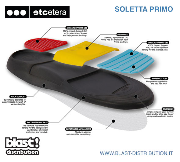 Pensate espressamente per lo skateboarding tutte le Etcetera sono assemblate su di una base in Poli-Uretano sulla quale trovano posto inserti in Gel a varia densità e spessore su tallone e avampiede. Inoltre al fine di proteggere il piede nei landing in primo, un supporto flessibile in TPU ad alta densità è situato in corrispondenza dell'arco plantare il Primo Pad