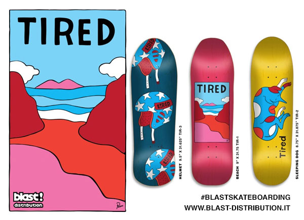 Ultima in ordine di Nascita in casa BigTime è Tired Skateboards. Si tratta di un brand di tavole specializzato in "Shape Boards" pensate per gli skater "re-Tired", che hanno scelto skateare per puro divertimento. Senza lo stress di imparare trick difficili o la pressione di diventare "bravi". Tavole dalle forme divertenti buone per skateare così come per il cruising. Il tutto completatto da grafiche esclusive curate da Parra.
