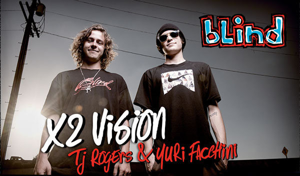 Blind Skateboards non smette mai di rinnorvarsi e dare spazio a giovani talenti, forse anche per questo a 25 anni dalla propria fondazione continua ad essere una company di successo. TJ Rogers e Yuri Facchini sono due degli ultimi "young rippers" ad essere entrati far parte del Team il primo Canadese, il secondo proveniente dal Brasile. In poche stagioni, lavorando sodo e skateando tanto assieme, i due sono cresciuti e migliorati a tal punto da divenire due dei rider di punti di un già eccellente Team.Proprio lo scorso anno, mentre erano in tour per l'europa, a Yuri e TJ è venuta in mente l'idea di lavorare ad un nuovo progetto video che li vedesse protagonisti. Dopo l'ok del team manager Bill Weiss, a distanza di un anno il progetto è diventato realtà e porta il nome di "X2 Vision".