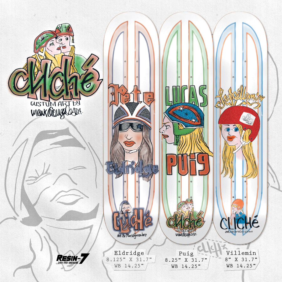 Per questa ragione esiste un rapporto molto particolare tra Gonzales e la company francese che, tra le altre cose, ha portato a 3 linee di prodotti realizzati in collaborazione. Questa nuova serie di tre tavole disegnate dal Gonz portano i nomi di Pete Eldridge, Lucas Puig e Lem Villemin. Prodotte con costruzione "R7" impiegando l'esclusiva Resina Epossidica per l'incollaggio le tavole "Cliché x Mark Gonzalez" impiegano per le grafiche un mix di inchiostri lucidi, opachi e glitterati per hanno un resa incredibile.