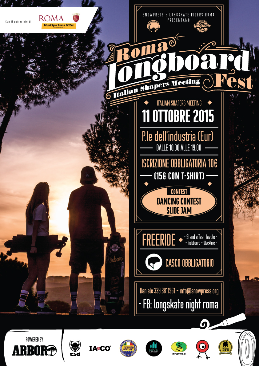 Domenica 11 ottobre in P.le dell’ Industria (EUR) in Roma si svolgerà la terza edizione del “Roma Longboard Fest–Italian Shapers Meeting” . Un occasione per incontrarsi, skateare in compagnia e conoscere alcuni tra i migliori skateboard shaper italiani. Per maggiori info potete consultare la pagina FB dell'evento